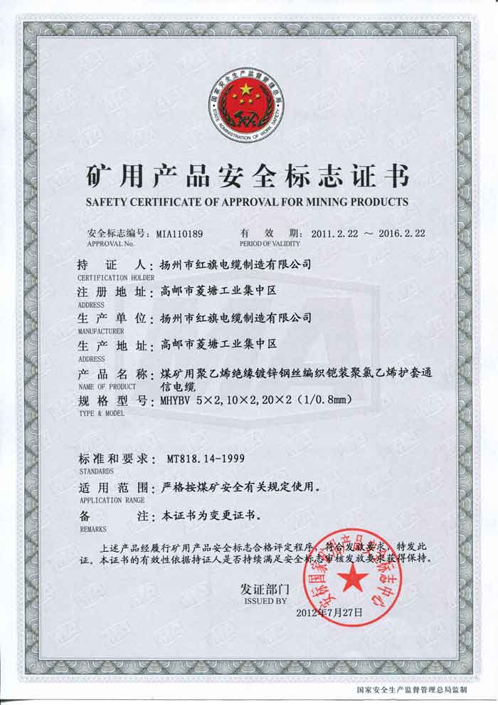 煤礦礦用產品安全標志證書-MHYBV0.8