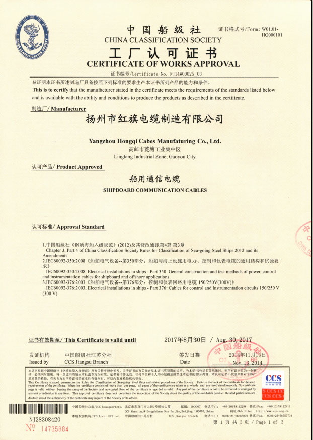 中國船級(jí)社工廠認(rèn)可證書(船用通信電纜)