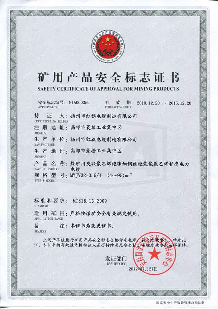 煤礦礦用產(chǎn)品安全標志證書-MYJV32